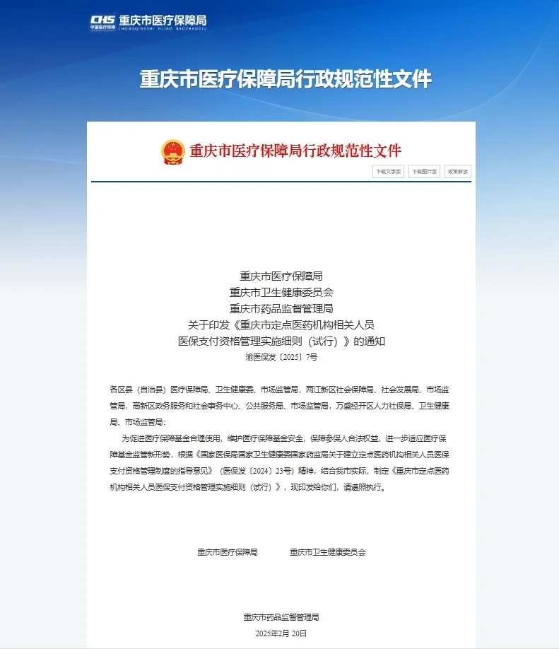 近日,重庆市医疗保障局、卫生健康委员会、药品监督管理局印发了《重庆市定点医药机构相关人员医保支付资格管理实施细则(试行)》(以下简称《细则》)(渝医保发〔2025〕7号),从3月1日起,我市正式建立定点医药机构相关人员医保支付资格管理制度,对定点医药机构相关人员实行“驾照式记分”,从而实现动态精细化管理。