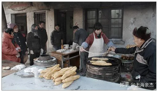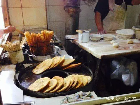 每天一大早,这家店里一个圆圆的炉子的灶肚里红蓝色的火苗奔腾一般往外窜起,使劲地舔着铁锅底。大师傅挽起袖子把湿乎乎的大饼伸向炉中贴在炉壁上烘烤。另外一个油锅旁,一位老阿姨手持长长的筷子正在煎炸油条和糍饭糕。跑堂的小师傅端着热气腾腾的豆浆忙前忙后招呼着客人。