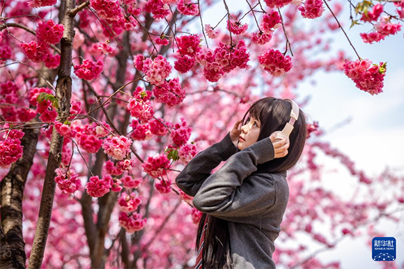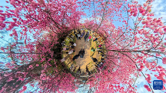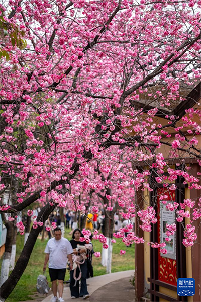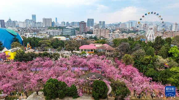 近日,云南昆明圆通山公园的樱花进入盛花期,吸引众多市民游客前来踏青赏花,感受春天的气息。新华社记者 胡超 摄