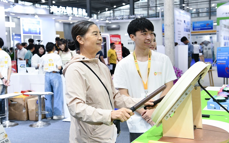 2024年10月27日,老人在2024深圳国际智慧养老产业博览会上体验乐龄鼓。(新华社)