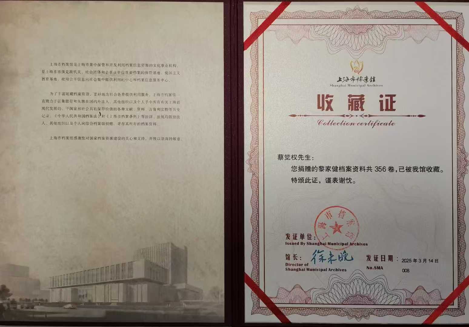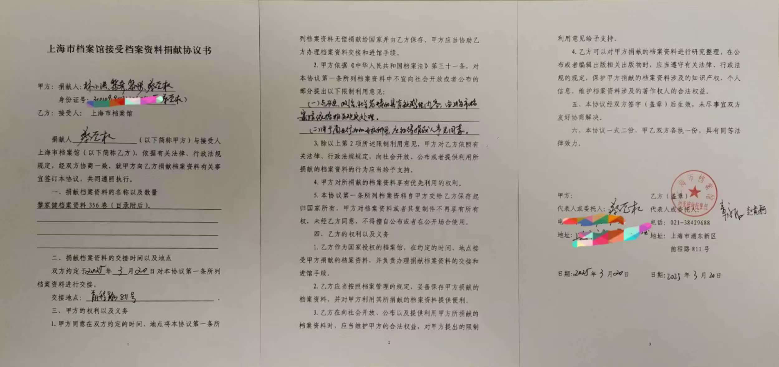 决定捐献时,正逢疫情刚过去,当时市档案馆新馆正在兴建中,而整理这批繁多的资料也是一项复杂艰巨的工程。不知不觉又过去了两年,现在听说已经整理完毕并入库收藏了,着实让人开心。我趁兴赶到上海市档案馆,档案接受征集部的章先生和赵小姐接待并介绍了整理情况,计有356卷。我代表家人对档案馆工作人员表示感谢,并对这些资料的利用提出我们的意见,双方签署了《资料捐献协议书》,档案馆郑重地给我颁发了收藏证。