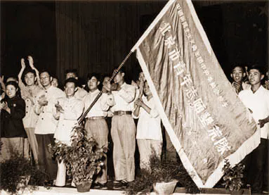 ◆胡耀邦向北京市青年志愿者垦荒队授旗。