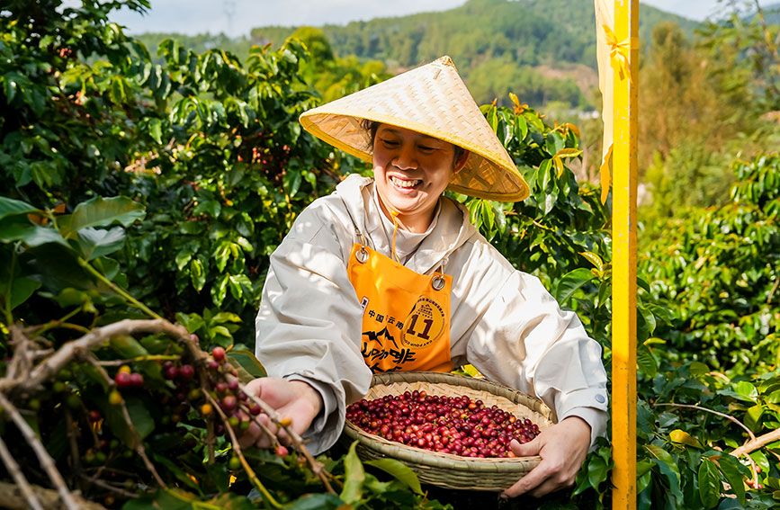 咖农正在采摘咖啡。人民网记者虎遵会摄