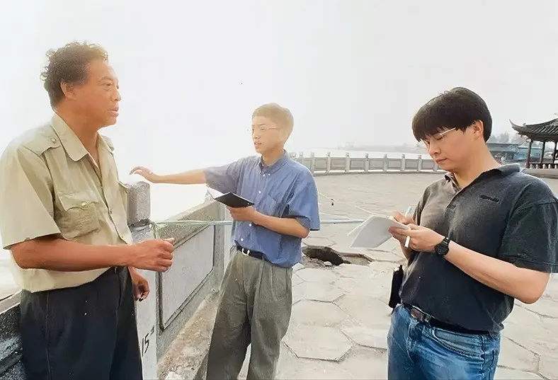 1998年夏长江水灾期间,本文作者陈季冰(右)与同事文汇报记者刘九洲(中)现场采访图。