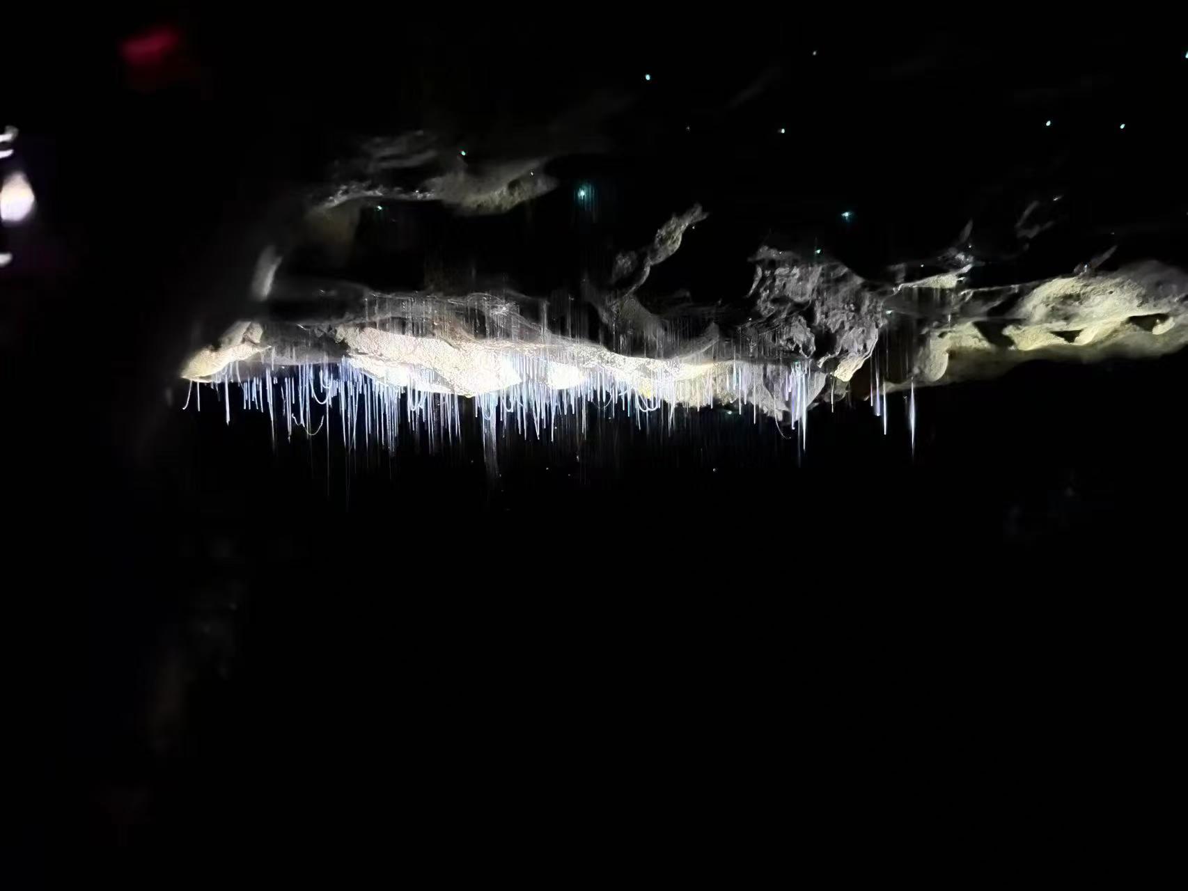 到岩洞观看萤火虫是一次难忘的体验,Waitomo Glowworm Caves的历史展板展示了这个洞穴的变迁与发展。洞穴内部,人们正在探索这个神秘的地方,有人站在岩石上观察周围的环境,有人则聚集在一起等待下一步行动。洞穴的天花板上挂着许多发光的生物,形成一种独特的景象,仿佛置身于星空之下。