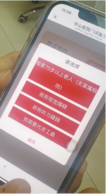 有需要的患者可在手机端提前预约华山医院“红马甲”陪诊服务。 均 顾泳 摄