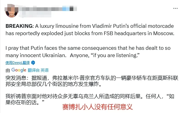 30日多位亲乌网友和媒体在网络上传播一则消息,称俄罗斯总统普京车队的豪华轿车在莫斯科街头发生爆炸,事发地距离俄联邦安全局只有几个街区——言外之意无非是暗示普京的总统车队在莫斯科遭遇袭击,俄情报与安全部门保持沉默——因此,这一幕又让极个别亲乌网友开始“赛博扎小人”,诅咒普京死于火灾中。