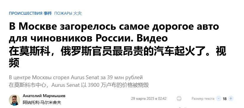 俄总统行政部门的公务车失火,等于普京车队遭遇袭击?