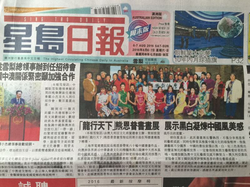 熊恩普先生已于8月3日回到中国上海,“龍行天下”熊恩普書晝悉尼巡回展在澳洲引起的巨波未断,《星岛日报》澳洲版于2016年8月6、7日以中间显赫位置刊登题为《龍行天下熊恩普書畫展 展示黑白凝煉中國風美感》通讯文章。 《星岛日报》由胡文虎于1938年创办,是一份历史悠久、发行网覆盖全球的中文国际报章。《星岛日报》除了在香港出版之外,也在美国、加拿大、欧洲、澳洲等地同时发行八份日报。《星岛日报》旨在为中产阶层读者群提供客观而深入的新闻报道,尤以教育和地产新闻深入人心。
