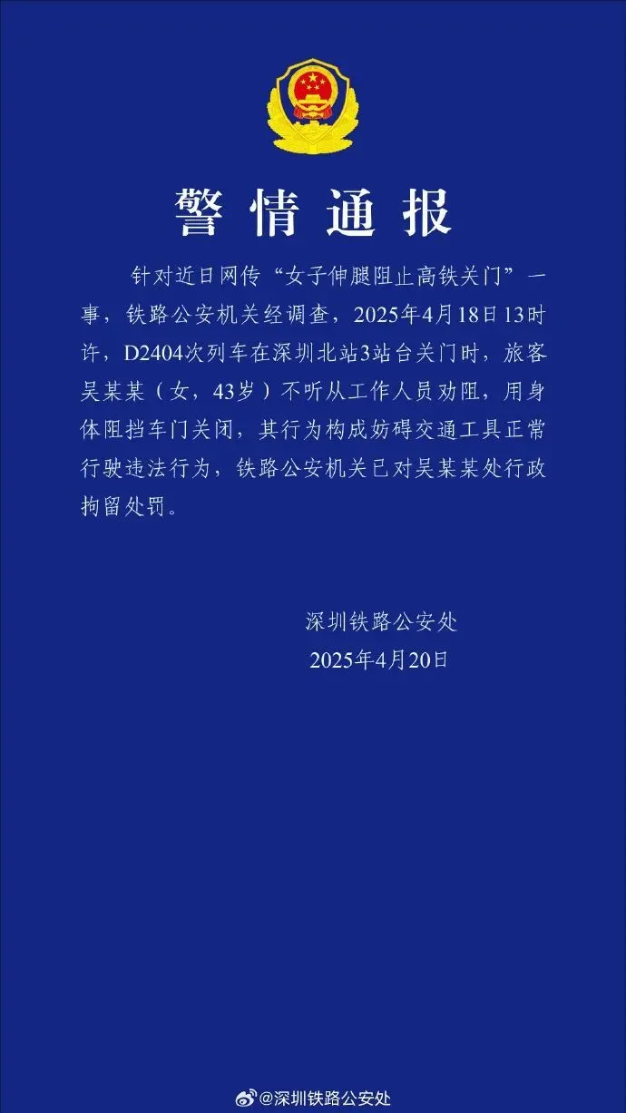 据@深圳铁路公安处 :针对近日网传“女子伸腿阻止高铁关门”一事,铁路公安机关经调查,2025年4月18日13时许,D2404次列车在深圳北站3站台关门时,旅客吴某某(女,43岁)不听从工作人员劝阻,用身体阻挡车门关闭,其行为构成妨碍交通工具正常行驶违法行为,铁路公安机关已对吴某某处行政拘留处罚。