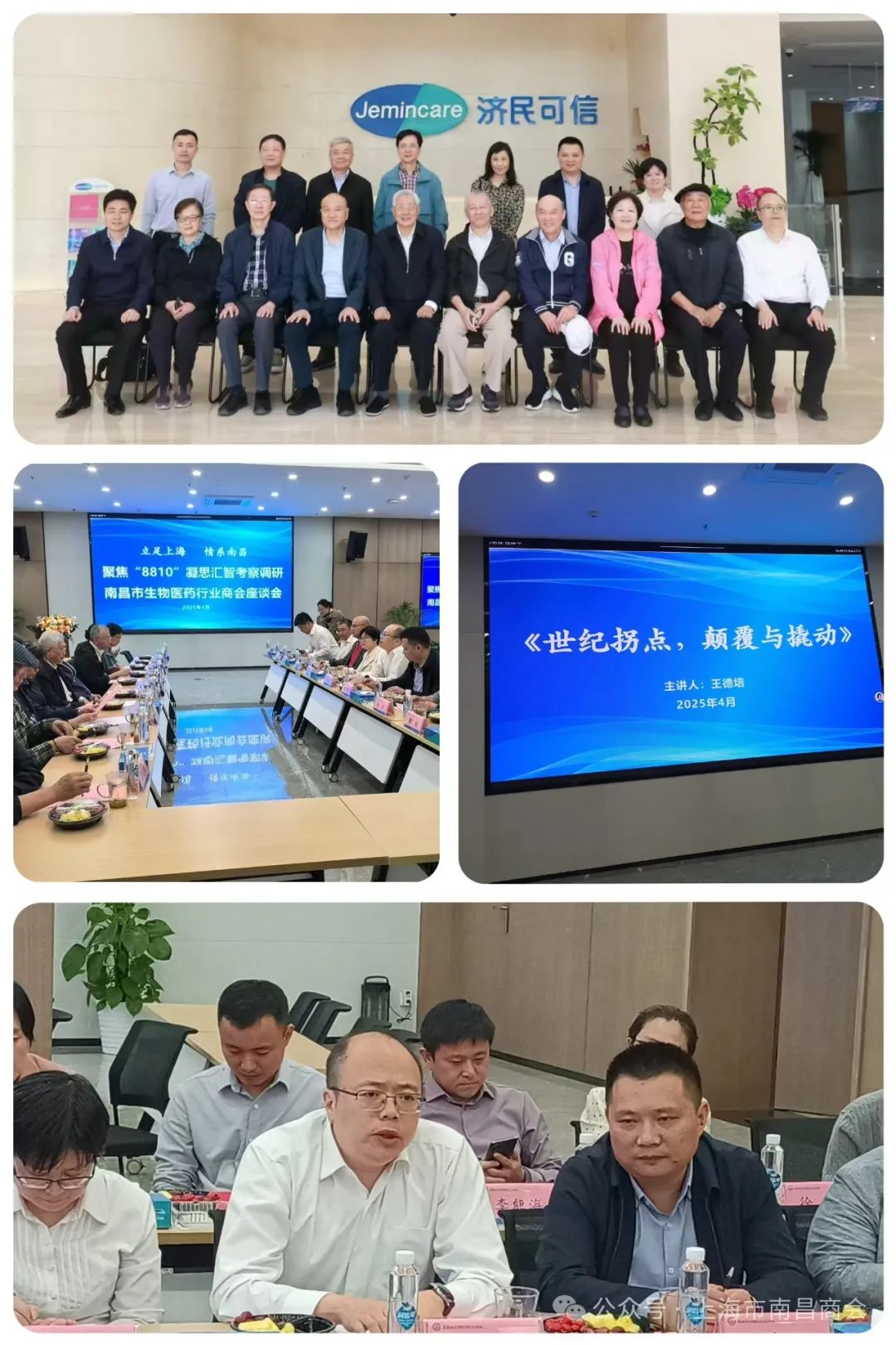 第二天,考察团来到了位于南昌小蓝经开区的数字经济头部企业江西飞尚科技有限公司,并在南昌市数字经济商会举办了座谈会,我会顾问、上海市发改委原常务副主任、上海市宏观经济学会会长王思政作了《数字经济与新质生产力:中国现代化产业跃迁的引擎》的主旨演讲,系统阐述数字技术如何赋能传统产业升级,引发与会者的热烈讨论。 随后,考察团参观了江西煌上煌集团的酱卤文化博物馆,领略了传统美食产业的现代化转型路径。 而在济民可信制药集团,这家中国医药工业百强企业的创新研发体系,让考察团对南昌生物医药产业的发展潜力有了更直观认知。考察团在南昌市生物医药商会举办了座谈会,会上,著名经济学家、上海福卡智库研究所所长王德培以《世纪拐点:颠覆与撬动》为题,剖析全球产业变革趋势,建议南昌抓住生物医药“风口”,构建“研发+制造+服务”一体化生态。 南昌市政府驻沪联络处主任许永晟、市工商联副主席陈东飞分别致辞,期待南昌上海两地深化产业协同与资源对接。 考察团还走访了南昌最大芯片企业兆驰半导体公司,深入了解企业在Mini LED芯片领域的技术突破。