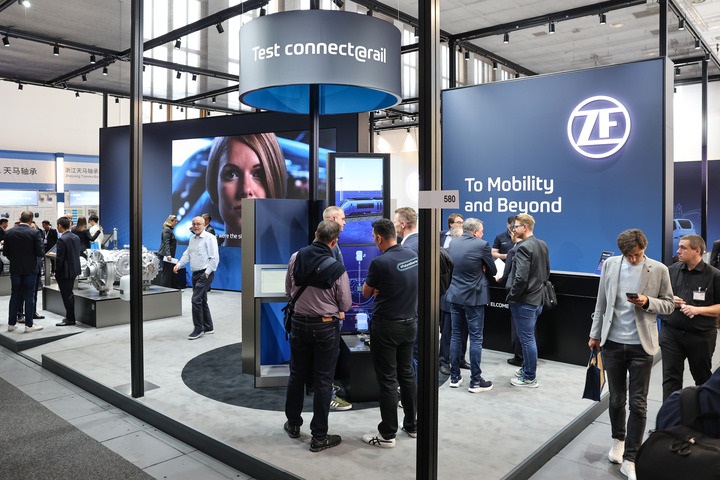 这是2024年9月26日在柏林国际轨道交通技术博览会上拍摄的德国采埃孚展区(车云龙 摄)