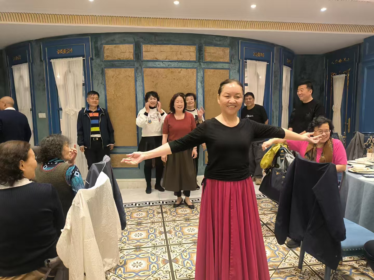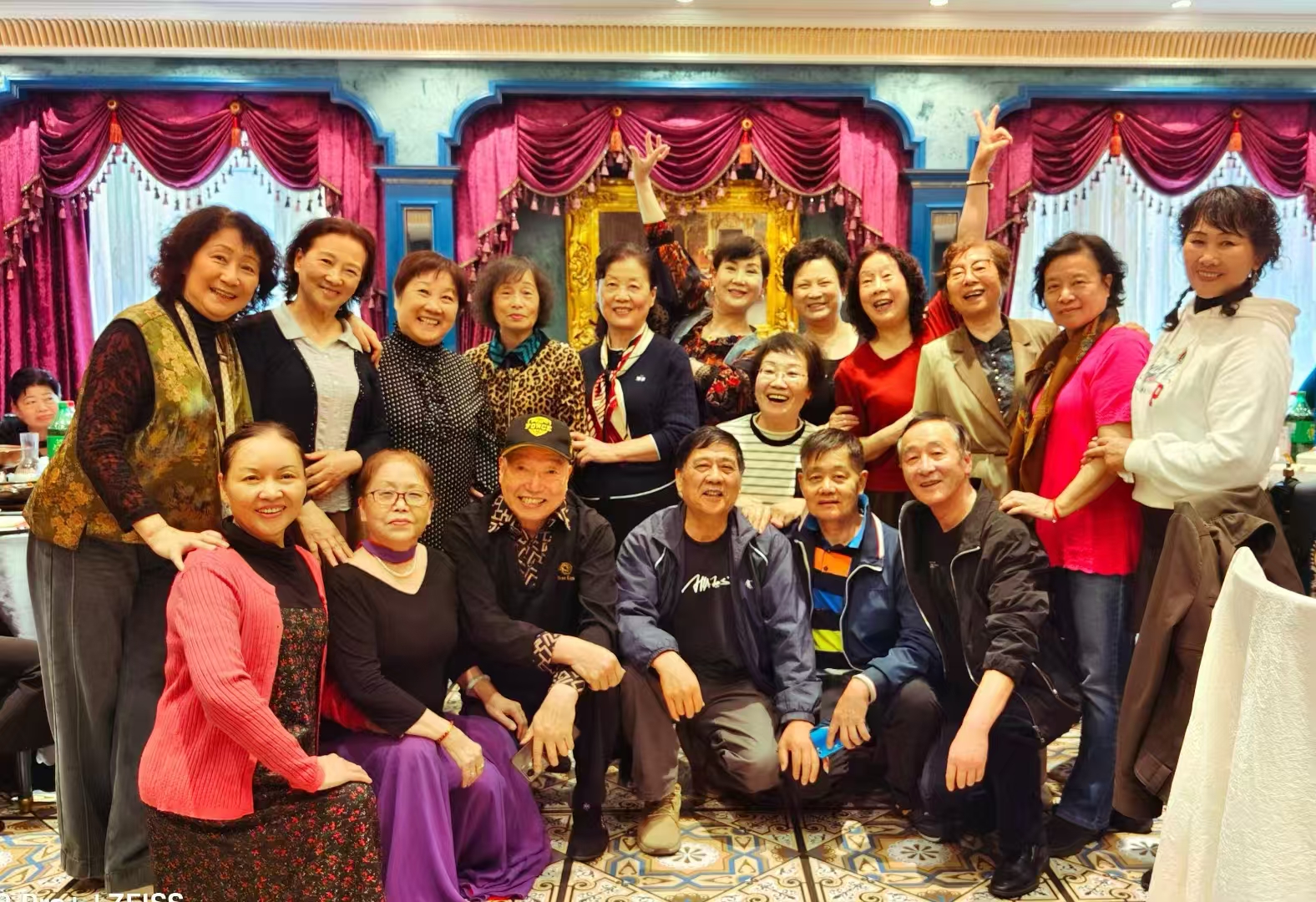 时隔多年,大家都到了七多八十的暮年,想唱想跳已经力不从心。团长召集50余人,相聚一起吃个"散伙饭",不由酸楚而不舍。目睹现场又跳又唱人人都是表演家的动人场景,可谓五味杂阵,那排练演出的一幕幕,仿佛就在昨天。一晃,我们真得老了,晚霞固然美,美在我们不老的心态,我们约定:人生路上继续尽朝晖。