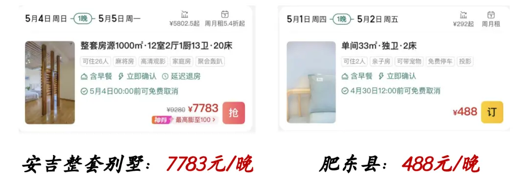 无论是安吉整套别墅7783元/晚,还是安徽肥东县一套33平的单间要价要488元/晚
