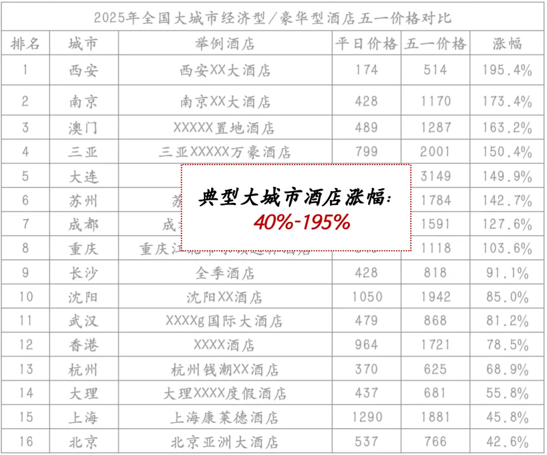 其中涨幅最高195.4%的西安某酒店,从平日的174元/晚涨价到514元/晚