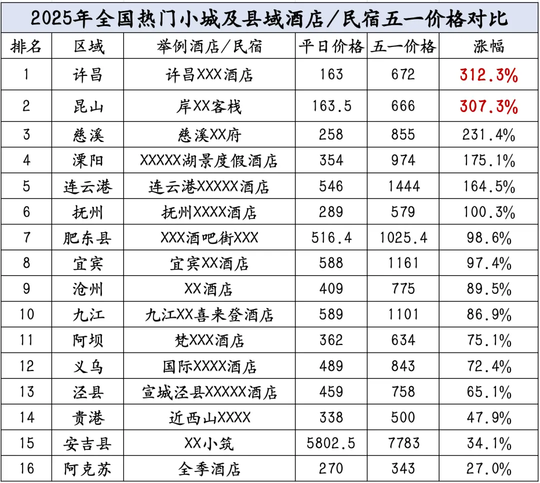 而当我整理完五一大部分城市的酒店涨价情况,更是肉眼可见如今小众景点以及县域酒店