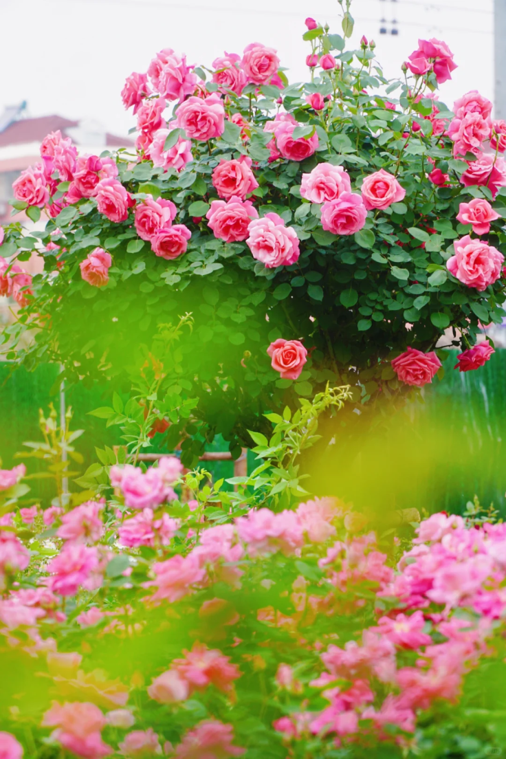 复兴公园作为沪上唯一完整保存的法式园林,超1500平方米的月季花海此刻进入全盛期!蔷薇、月季悉数绽放,深浅不一的粉白浪潮织就印象派调色盘,犹如现实版莫奈花园般唯美浪漫