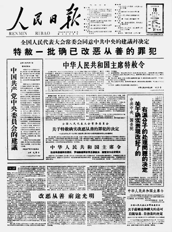 ◆1959年9月18日,特赦的消息上了《人民日报》头版头条,同时还配发了《改恶从善,前途光明》的社论。