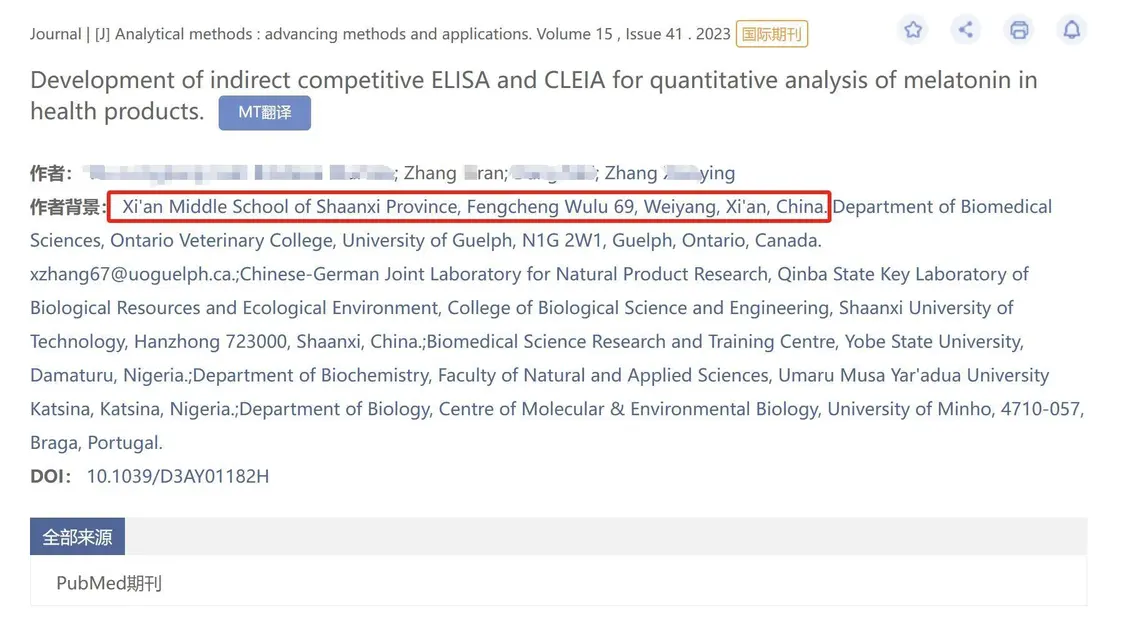 记者在知网查询网友所提到的论文,发现该论文作者一栏的确有张某苒和张某莺的名字。作者简介一栏也写道,张某苒系陕西省西安中学学生,张某莺系陕西理工大学特聘教授。论文发表时间为2023年10月17日,发表期刊为《Analytical Methods》。