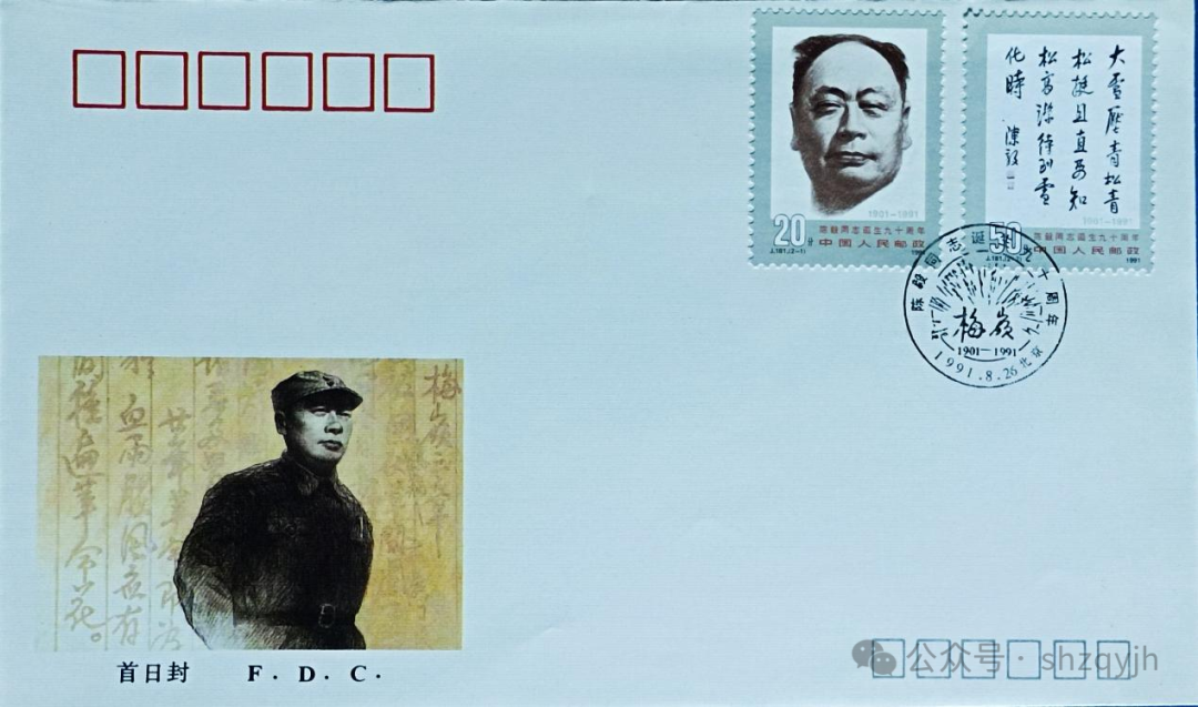 陈毅任上海市市长后,紧紧依靠工人阶级,团结全市人民,战胜了国内外敌人的破坏和封锁,迅速恢复和发展生产。1954年,他被任命为国务院副总理,并任中央人民政府人民革命军事委员会副主席、国防委员会副主席。1958年11月,陈毅离开上海赴北京任外交部长。 1991年8月26日邮电部发行《陈毅同志诞生九十周年》纪念邮票。纪念邮票共2枚。第1枚20分,图案是陈毅的标准像。第2枚50分,图案选用了陈毅手书的一首诗稿“大雪压青松,青松挺且直;要知松高洁,待到雪化时”。图5为中国集邮总公司发行《陈毅同志诞生九十周年》纪念邮票首日封。封、戳设计陈张平。