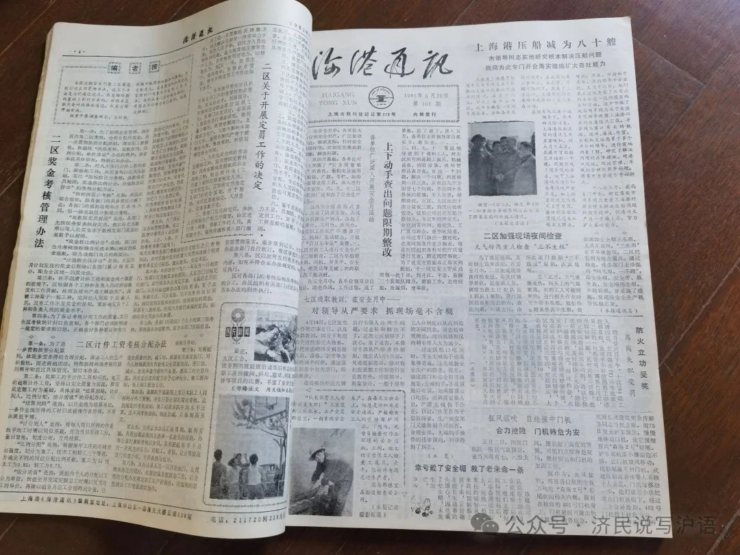 972年1月,我离开崇明农场后进入上海港工作。先是在上港六区当装卸工。装卸是港区第一线工作,辛苦,劳累,肮脏,还危险。白天黑夜三班倒,刮风下雨、严寒酷暑照样干。我大难不死就有三回。四年半的装卸工生涯劳了筋骨,伤了身体,可谓刻骨铭心,难以忘怀。 1976年6月,我被当时的上海港务局政宣组借调到上海港港史编写组工作,在上海人民出版社编写《上海港史话》一书。三年的写作,让我全面了解了上海港的历史,提高了写作能力。这为自己今后从事文字工作打下了基础。 史书出版后,我回到上港六区,在复查办公室和主任办公室工作。不久,又借调到局《海港通讯》(《上海海港报》前身)编辑室工作。一年多的办报工作,让我对上海港各港区的情况有了较为全面的了解,写作能力也有了进一步的提高。