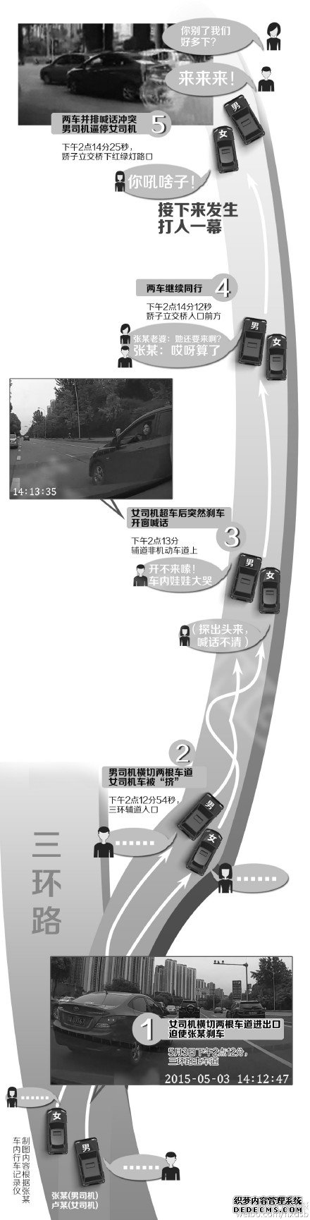 5月3日下午2时13分,一辆红色的polo轿车在成都娇子立交下将红色现代轿车逼停后,一名男子从polo轿车上下来,冲到现代轿车驾驶室旁,伸手和车内女子发生抓扯。2时13分20秒,男子伸手从车门内侧将门打开,用力拖拽,将车内女司机拖出来摔在地上。