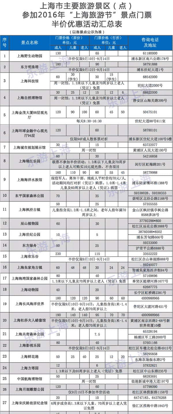 附:上海市主要旅游景区参加2016年”上海旅游节“景点门票半价优惠活动汇总表