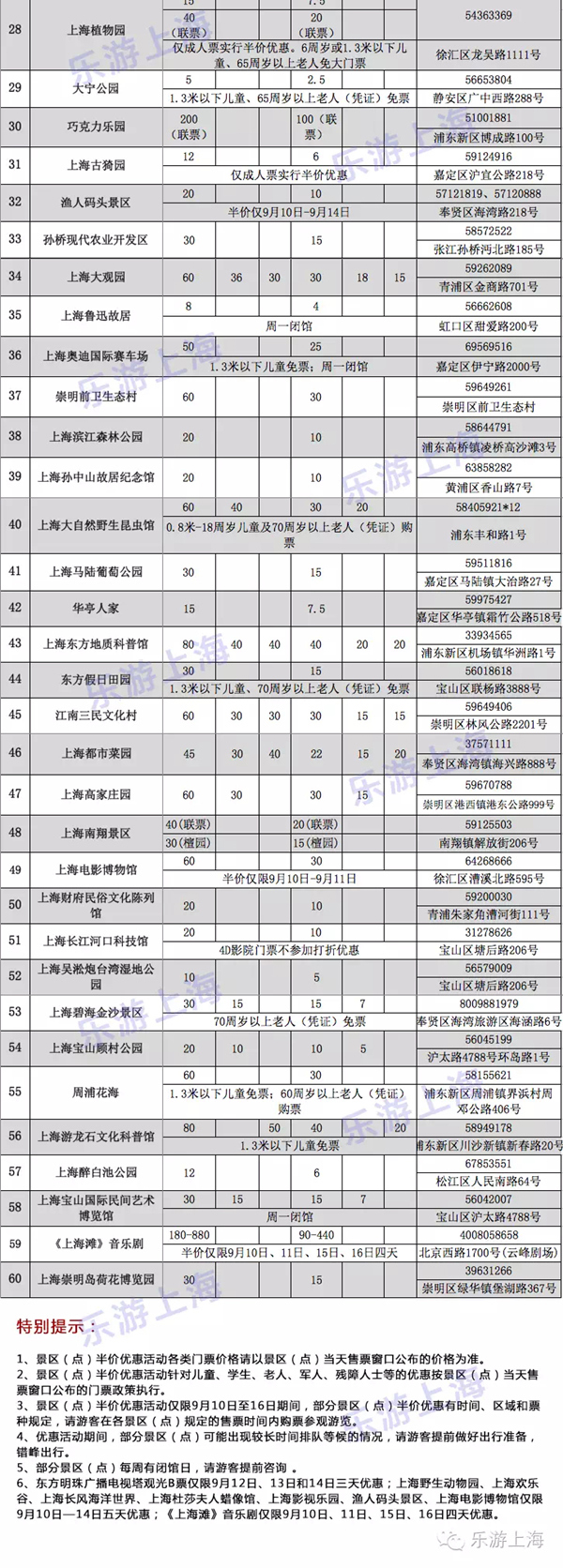 另外,9月10日至9月16日,上海60家景点的门票半价优惠。不过,游客需留意各景点告示。比如,东方明珠广播电视塔观光B票仅限9月12日、13日和14日三天优惠;上海野生动物园、上海欢乐谷、上海长风海洋世界、上海杜莎夫人蜡像馆、上海影视乐园、渔人码头景区、上海电影博物馆仅限9月10日至14日五天优惠;《上海滩》音乐剧仅限9月10日、11日、15日、16日四天优惠。
