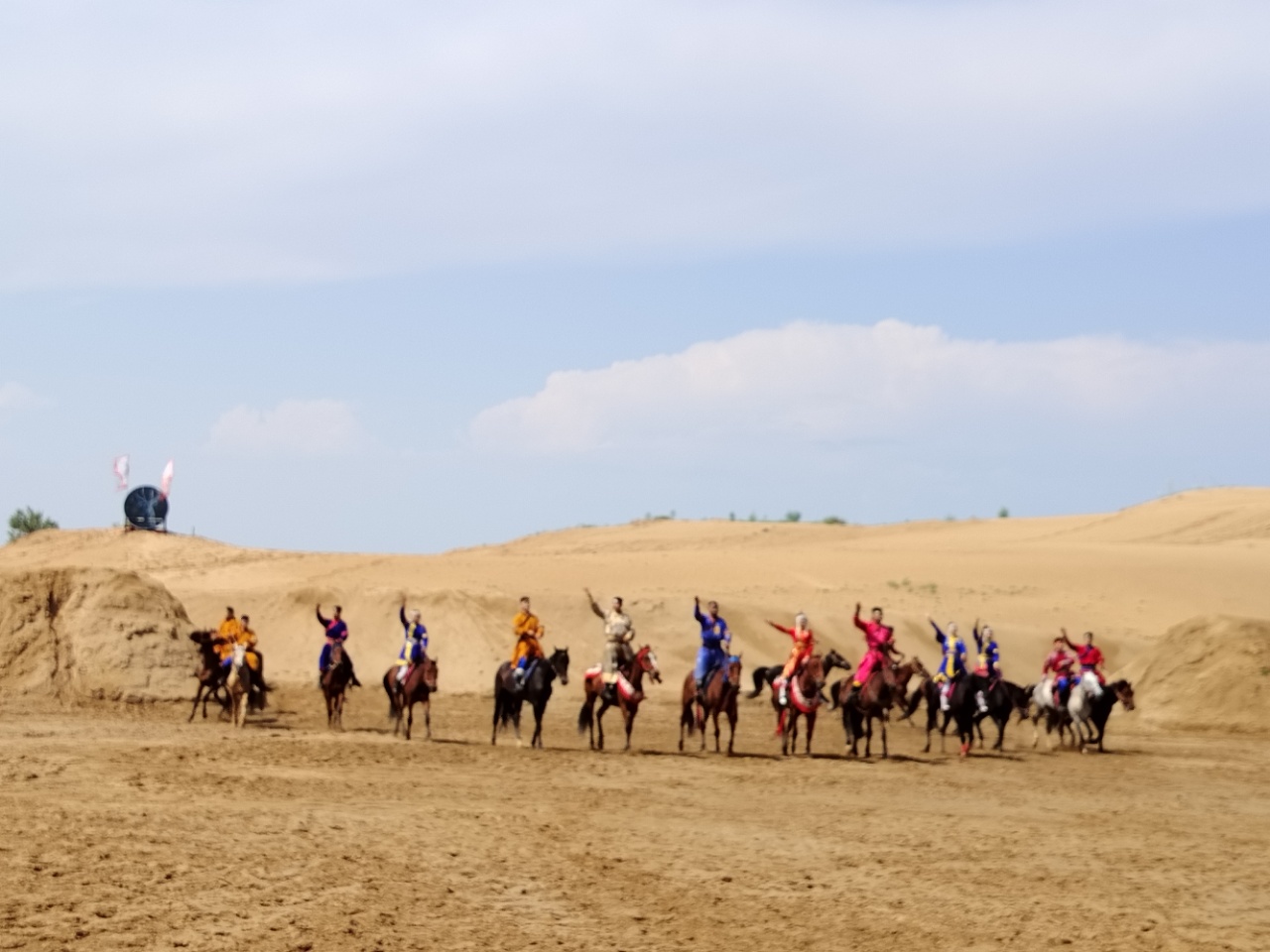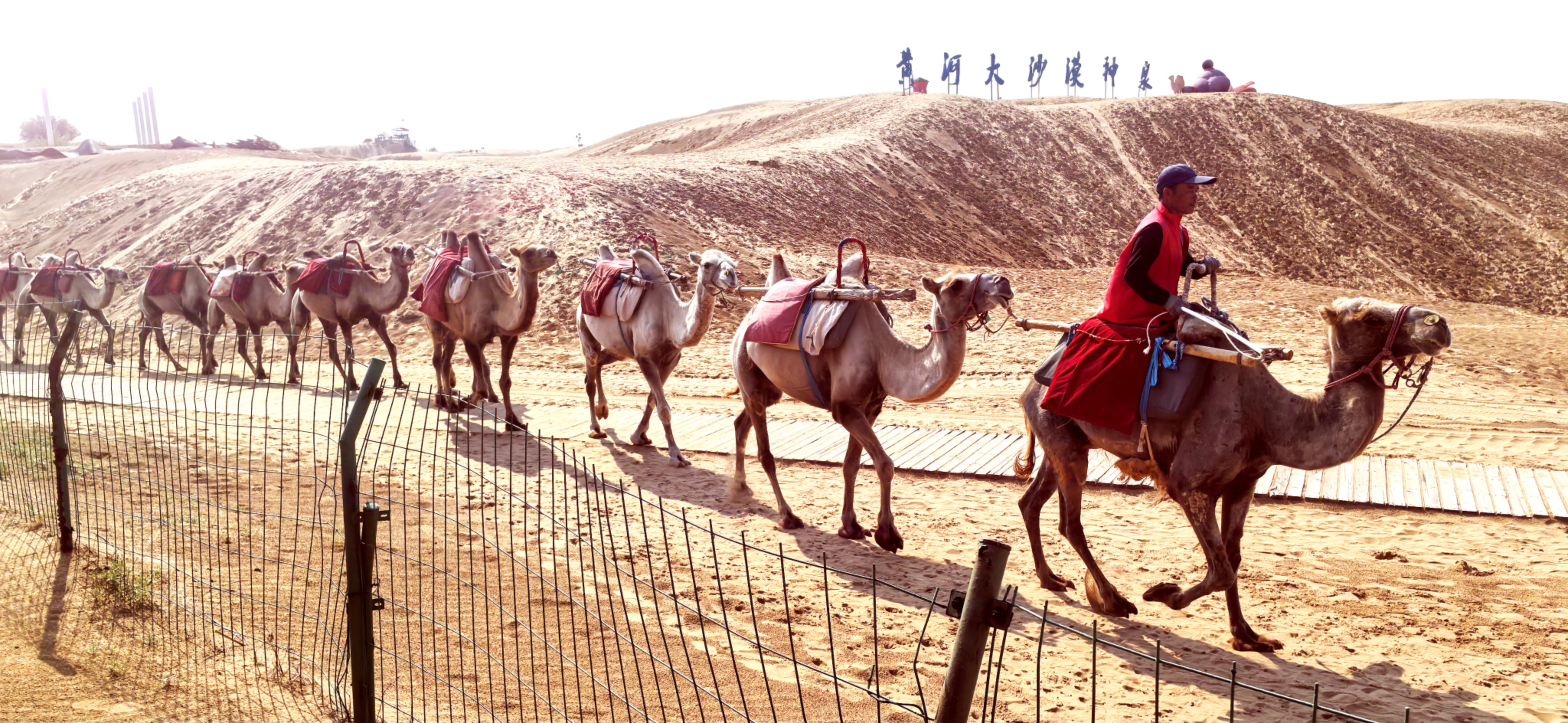 沙漠越野车在起伏的沙脊上划出蜿蜒轨迹,远处骆驼的驼铃声中,游客的欢笑声与苍凉的沙漠形成奇妙共鸣。我们在沙海中遨游,坐冲浪车,看杂技,观马术表演,又乘沙漠小火车行驶在沙丘与绿草松林间,领略沙漠变绿洲的奇迹,似有“大漠孤烟直,长河落日圆”的壮美景象,令人遐想无限……