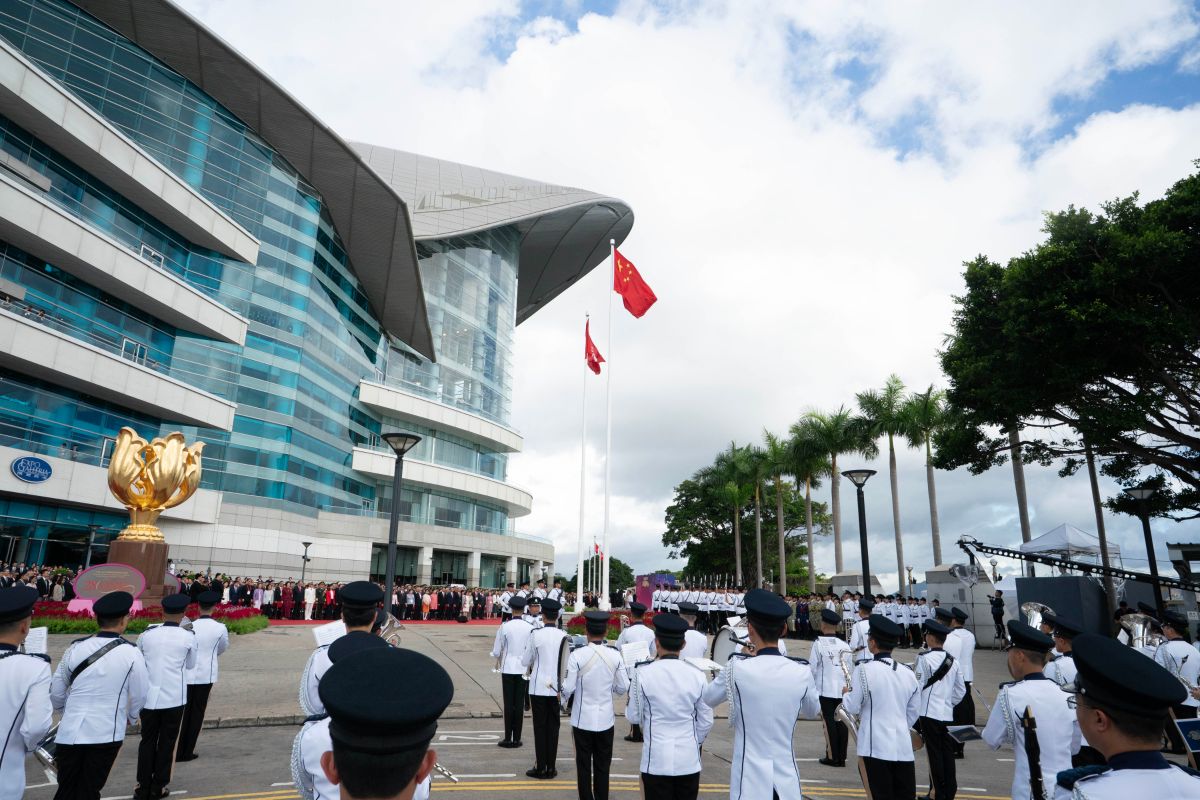 李家超伉俪于7时52分左右进场。警察银乐队在现场奏乐,护旗方队及仪仗队以中式步操进场,飞行服务队多架直升机分别悬挂国旗及区旗飞过维港上空,消防船及水警轮则在海面喷水花致敬。