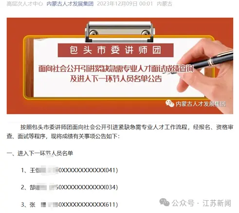 两次招聘,一份名单?2023年12月,包头市委讲师团曾进行过一轮面向社会公开引进高层次和紧缺急需专业人才的招聘活动,当时因被举报中止。然而,今年2月份再次招聘发布的公示名单中,3名通过面试的考生姓名,与此前因举报被中止时入围面试的考生姓名居然一致。