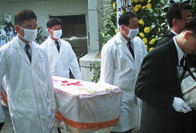 1997年2月,韩国首尔南部盆塘医院殡仪馆,李韩永的棺材被当地基督教组织抬出