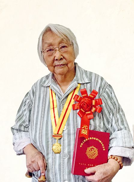 满头白发的老人家,非常认真地梳理打扮了一番,在胸前戴上写有“光荣”二字的大红花,并挂上了那枚金灿灿的纪念章。她让儿子给她拍照留念,庄重地定格了这一珍贵瞬间。