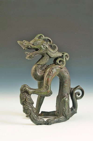 走进黑龙江省博物馆,只见这尊龙是麒麟头、蛇身、鹰爪、卷鬣,全身光滑无鳞,头颈微扬,肩背前弓,左前腿翘起,踏着一簇卷曲的祥云,迥异于唐宋时期中原地区常见的卧、旋、盘、腾等形态。