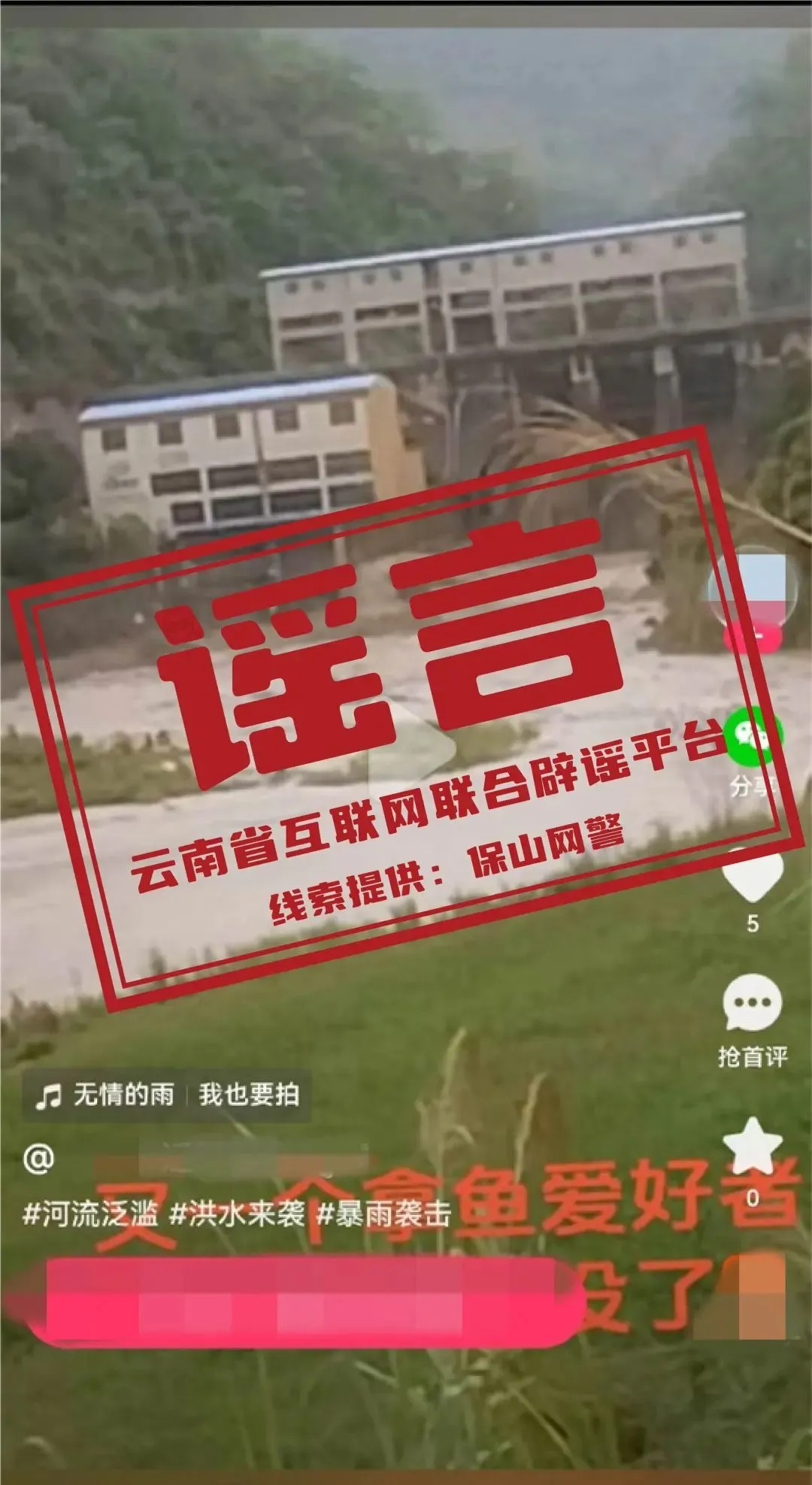 防汛抗灾是一场争分夺秒的硬仗,宝贵的社会注意力与救援资源如果被谣言牵制,不仅容易引发公众焦虑恐慌,更可能干扰指挥决策与救援部署,影响防汛抗灾工作正常开展。近期,受持续强降雨影响,云南部分地方出现洪涝险情,面对肆虐的洪水,广大群众团结一心,多部门迅速响应,第一时间组织抢险力量,众志成城抗击自然灾害。然而,个别网民为博取流量,吸引眼球,散布汛情造成人员伤亡谣言,扰乱社会公共秩序,公安机关已依法处理。