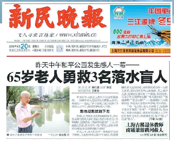 经媒体报道,八旬老兵孙灶立见义勇为的事迹不胫而走,他以前多次救人的故事也被更多人知晓。原来,早在2009年,当时65岁的他就曾在和平公园救下三名落水盲人,还因此登上了本报头版头条(见上图)。他回忆当时自己正在公园里下围棋,听到呼救声,立刻甩掉鞋子,衣服裤子都来不及脱,冲出围观人群,跳进湖里救人。更早的时候,他还在贵州工作,也曾在水库和河里救过落水者。