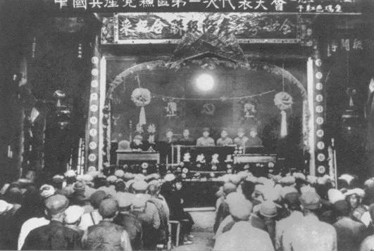 ◆1931年11月1日至5日,由临时中央派出的中央代表团在江西瑞金主持召开中央苏区党组织第一次代表大会(即赣南会议),主席台右四为毛泽东。