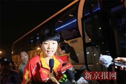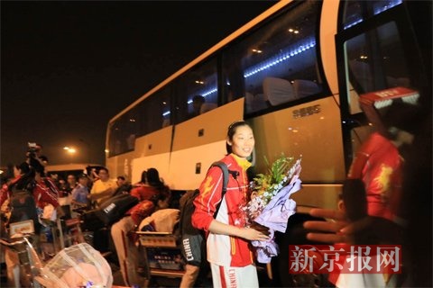 队长惠若琪第一个走出来,面对球迷的呐喊,她微笑着挥了挥手。随后,朱婷、袁心玥、刘晓彤、魏秋月等队员渐次出来。面对前来接机的排协相关领导和工作人员,姑娘们高兴地和他们击掌拥抱。
