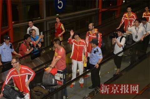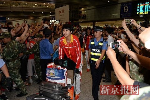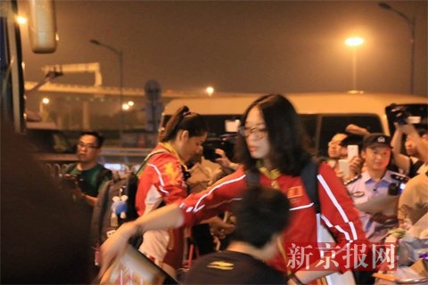 23日晚23时许,在里约奥运会拿到金牌的中国女排回到北京,在首都国际机场,她们受到了上千名球迷的热情欢迎。