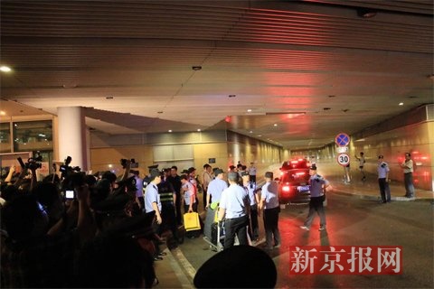 袁心玥在民警护送下从接机出来,受到球迷热烈欢迎。摄影吴江