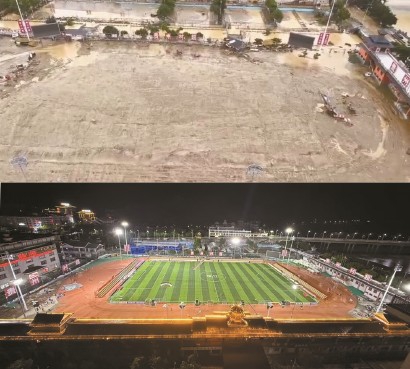 “村超”球场遭遇洪水后的样子(上)与重建后的对比图。资料图片