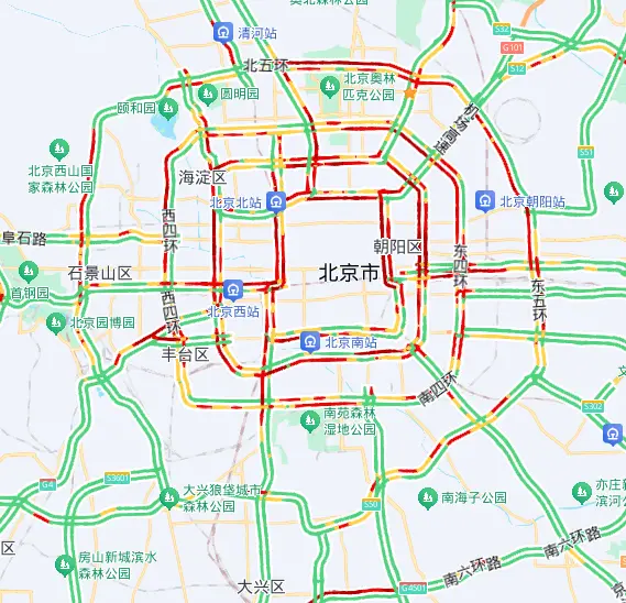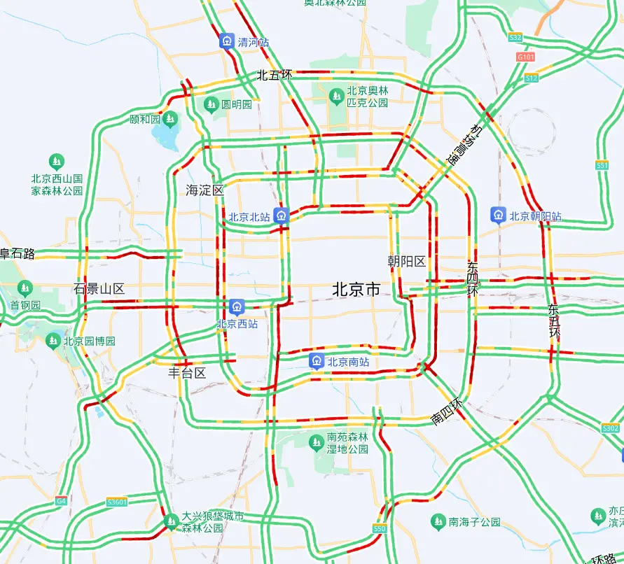 预计早高峰期间,城区东部、西部、北部主要环路部分路段,菜户营南路、莲石东路、阜石路等联络线进京方向部分路段,京藏、京开、京港澳、京通快速等高速公路进城方向部分路段车流集中。太阳宫、劲松、崇文门、三元桥等区域交通压力相对较大。