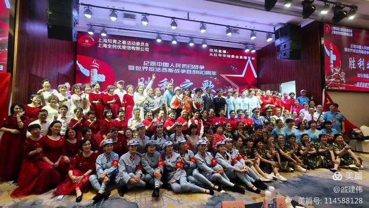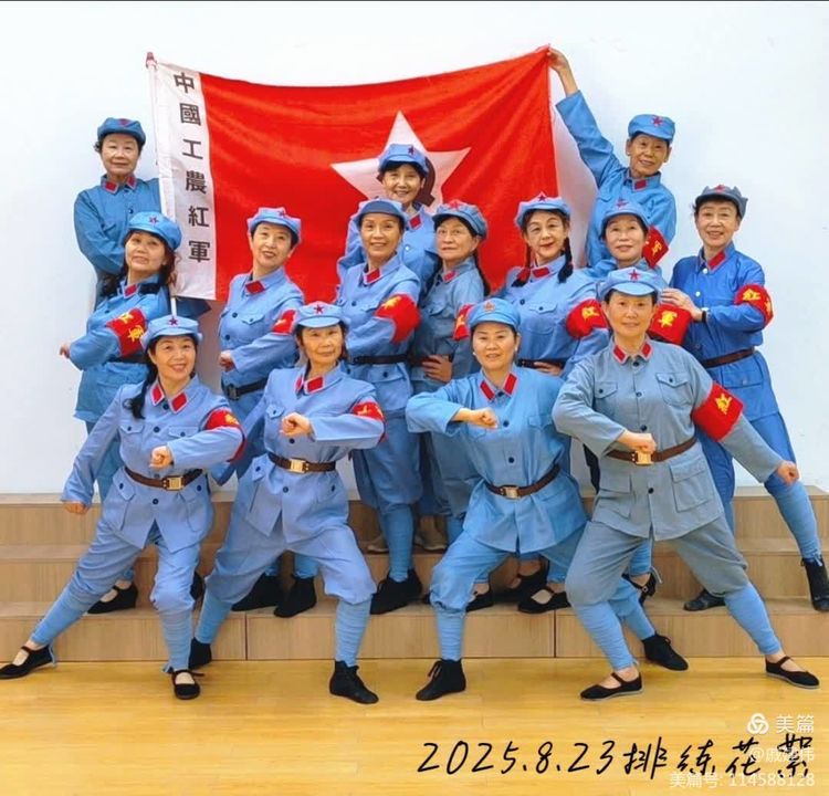 军旗挥舞下,一身戎装,飒飒英姿,满场身手敏捷地旋转跳跃,激情饱满的肢体动作,犹如战场上冲锋陷阵的将士,把我们带到了那个难以忘怀的烽火年代。谁能想象到这是一支步入古稀之年的娘子军演艺队伍?!为了纪念抗战胜利80周年的文艺演出,整个夏季,她们怀着对祖国母亲朴素的情感,怀着对盛世中华美好家园的无限热爱,克服家庭安排上的诸多困难因素,以及暑期旅游度假时间上的冲突,甚至个人身体不适等等,顶着烈日奔波在排练途中,挥洒着汗水,在舞蹈指导老师地悉心带教下,无数次地苦练舞蹈动作,以近乎完美地完成了节目的排练。当天表演震惊全场观众,雷鸣般经久不息的掌声,似乎已为队员们的付出画上了圆满的符号,成了整台演出最出彩的一抹亮色,也就在这样一个瞬间,一个个引以为自豪的倩影定格在了这难忘的时刻。