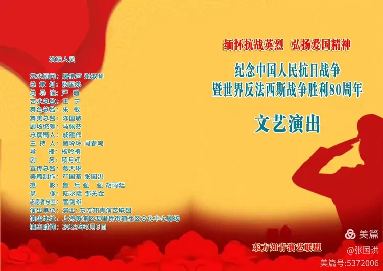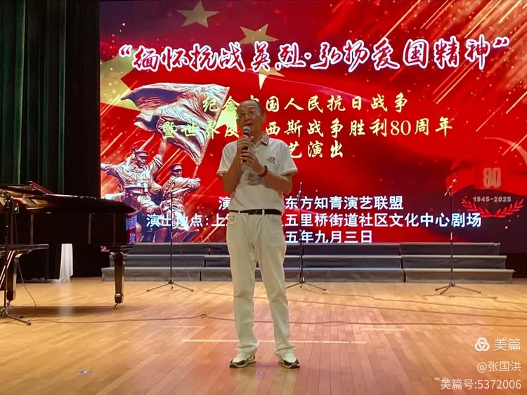 为缅怀抗战英烈、弘扬伟大爱国精神,纪念中国人民抗日战争胜利80周年,2025年9月3日,由东方知青演艺联盟主办的主题文艺演出在黄浦区五里桥社区文化活动中心温情开演。来自上海多支文艺团体的表演者们,以歌声、舞蹈、朗诵等多样形式,带领现场观众重温峥嵘岁月,感受红色信仰的力量。