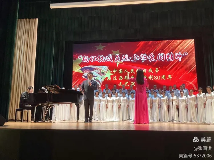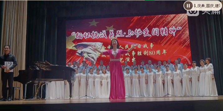 接着,演出正式开始。上海欧阳知青合唱团带来的大合唱《在太行山上》《过雪山草地》,领唱鲁耀东嗓音浑厚激昂,指挥李向荣精准把控节奏,冼耀聪的钢琴伴奏铿锵有力,合唱团成员们饱含深情的演唱,将八路军在太行山区浴血奋战、红军过雪山草地的艰辛与坚定展现得淋漓尽致,瞬间点燃现场观众的爱国情怀。