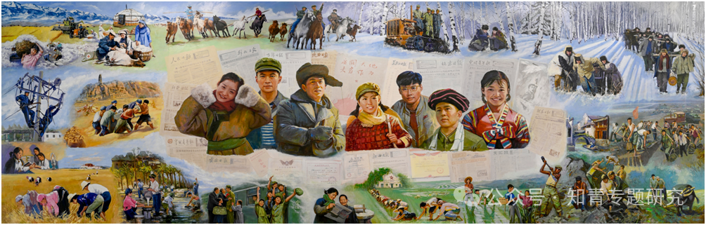 著名油画家徐纯中还为国家方志馆知青分馆(黑河知青博物馆)创作了中国知识青年上山下乡史全景油画《知青这一代》(图与说明为编者附加)。