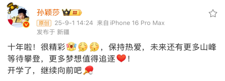 9月1日,孙颖莎在微博发文,庆祝自己入选国家队10周年。文章配图上的莎莎面带笑容,手捧蛋糕,状态轻松。蛋糕上的小便签写着“十载荣耀路,未来更璀璨。”她说,十年啦!很精彩,保持热爱,未来还有更多山峰等待攀登,更多梦想值得追逐!