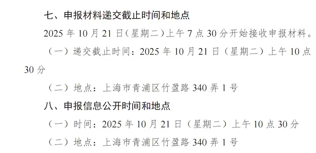 采购文件明确,第11批集采企业申报材料递交的起始时间为2025年10月21日(星期二)早晨7点30分到上午10点,申报信息公开时间(开标)时间为上午10点30分,接受申报材料和申报信息公开的地点为上海市青浦区竹盈路340弄1号。