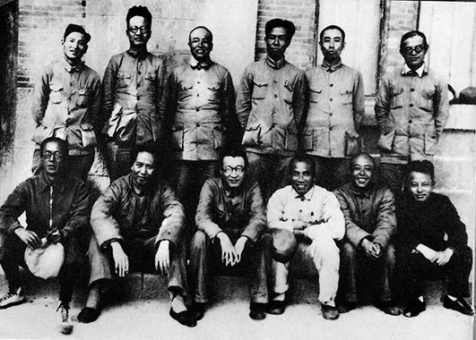 ◆1938年9月,中共中央六届六中全会在延安举行,会议决定刘少奇任中共中原局书记,赴华中开辟工作。图为出席六届六中全会前举行的中央政治局会议人员合影,后排右三为刘少奇。