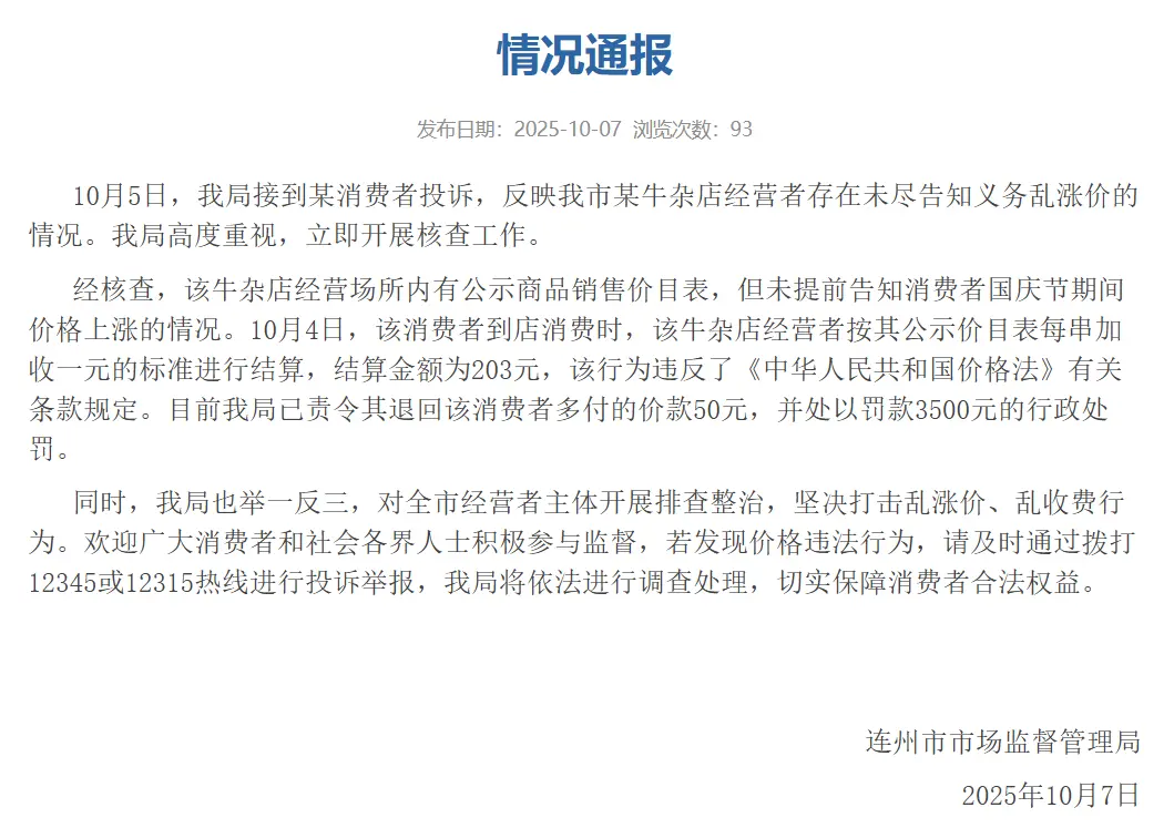 经核查,该牛杂店经营场所内有公示商品销售价目表,但未提前告知消费者国庆节期间价格上涨的情况。10月4日,该消费者到店消费时,该牛杂店经营者按其公示价目表每串加收一元的标准进行结算,结算金额为203元,该行为违反了《中华人民共和国价格法》有关条款规定。目前我局已责令其退回该消费者多付的价款50元,并处以罚款3500元的行政处罚。